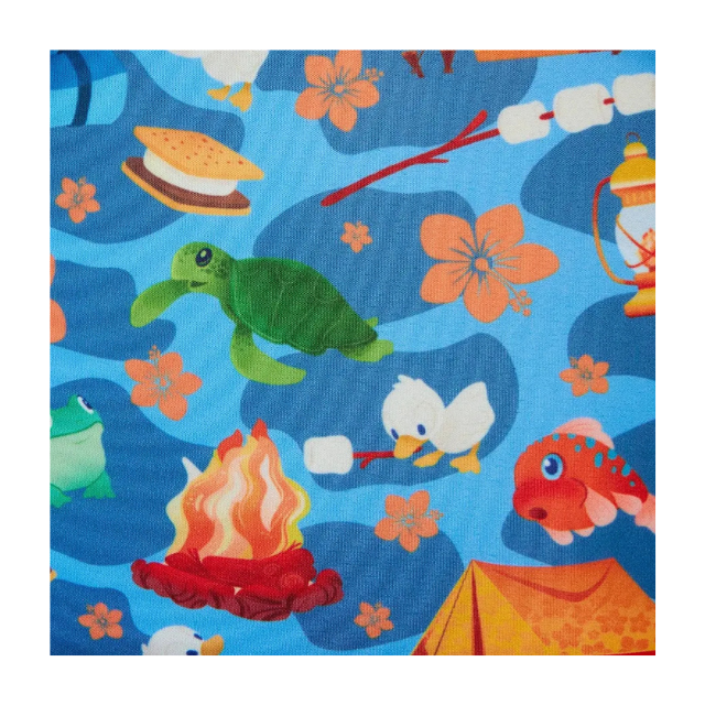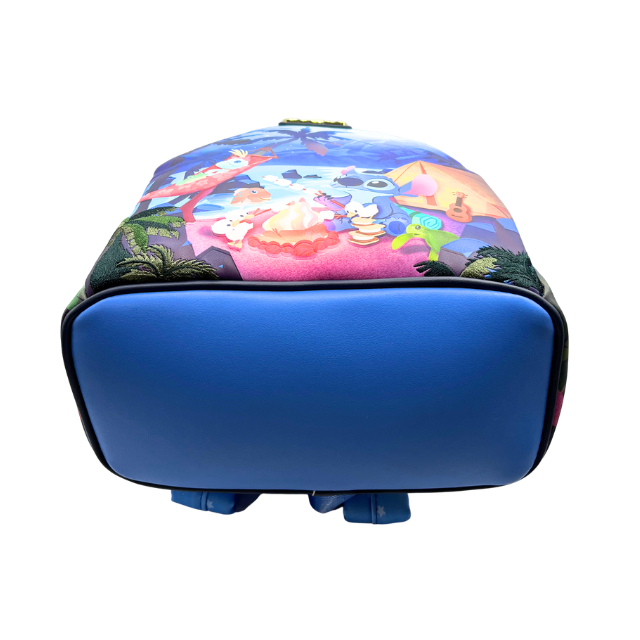 Playful "Camping Cuties" Design: Stitch and Angel are featured in vibrant detail on the front pocket, surrounded by a lush tropical forest and a flickering campfire.