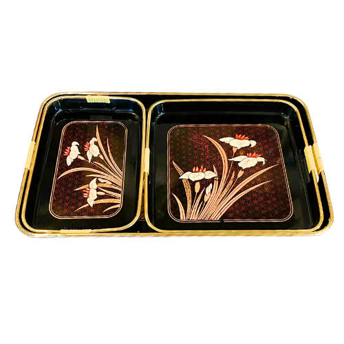 MCM Japanese Lacquer 3 Piece Nesting Serving Tray Set Black Gold Red White Iris Floral Design