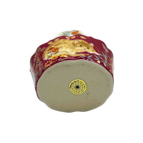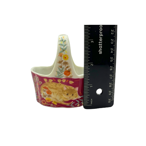 Takahashi Porcelain Miniature Basket w/Cat Floral Design on Burgundy Base Made in Japan