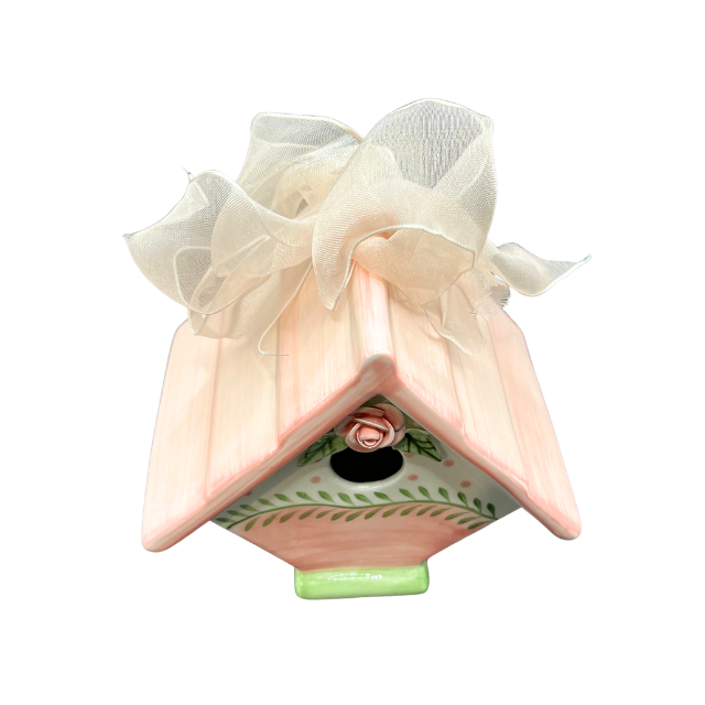 The roof is accented with a delicate bow and a small porcelain bird perched on top, making it a perfect accent piece for a nursery, garden-themed room, or a Spring/Easter display. Its petite size makes it ideal for styling on tiered trays or bookshelves.