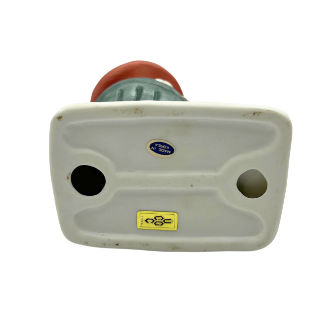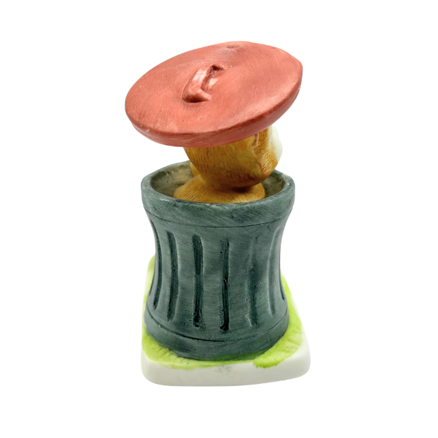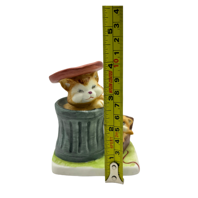 This whimsical porcelain bisque figurine features a curious orange tabby cat peeking out from a green trash can while a tiny kitten plays at the base. Produced by UCGC and made in Korea, this piece captures a playful, "naughty but cute" moment that collectors of vintage animal decor will adore.
